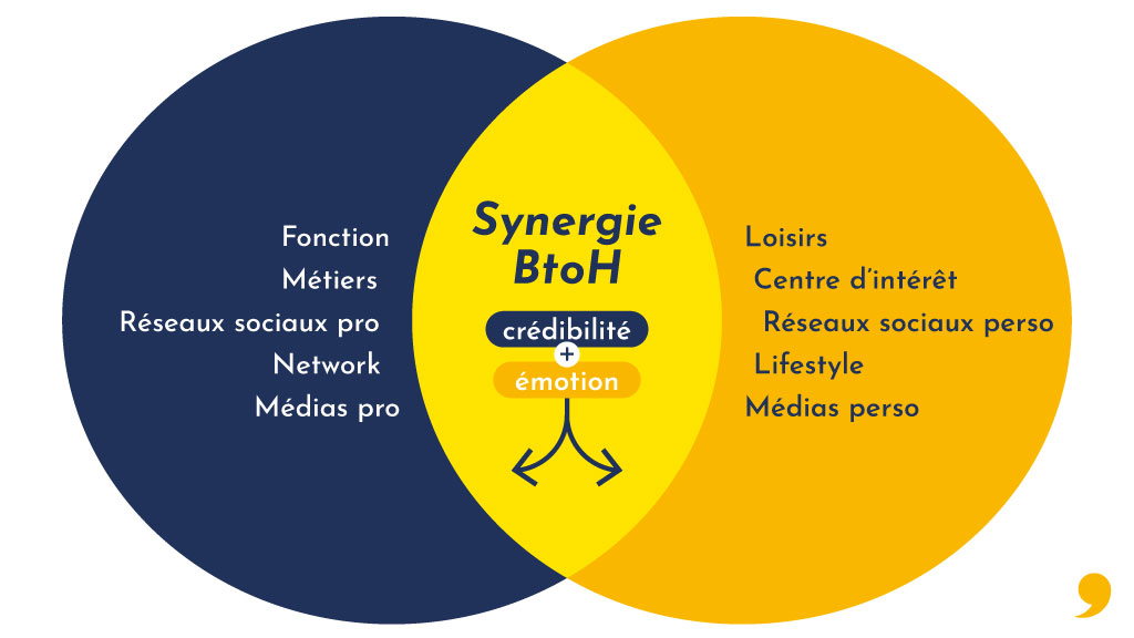 Contrairement aux approches BtoB (Business to Business) ou BtoC (Business to Consumer) qui segmentent les audiences selon leur statut, le BtoH unifie cette vision.