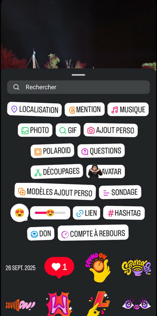 - Les autocollants : ces derniers sont nombreux et permettent d’agrémenter vos stories. De la localisation au compte à rebours, les autocollants peuvent aussi vous aider à communiquer avec votre communauté. Vous pouvez par exemple mettre en place un sondage pour demander leur avis