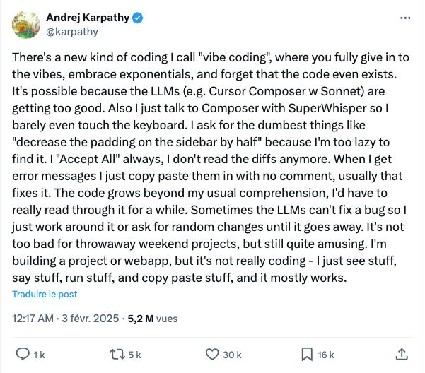 Il faut remonter en février 2025, et être sur X pour entendre parler pour la première fois du terme vibe coding. Le 3 février 2025, Andrej Karpathy, le co-fondateur d’OpenAI tweete ceci :